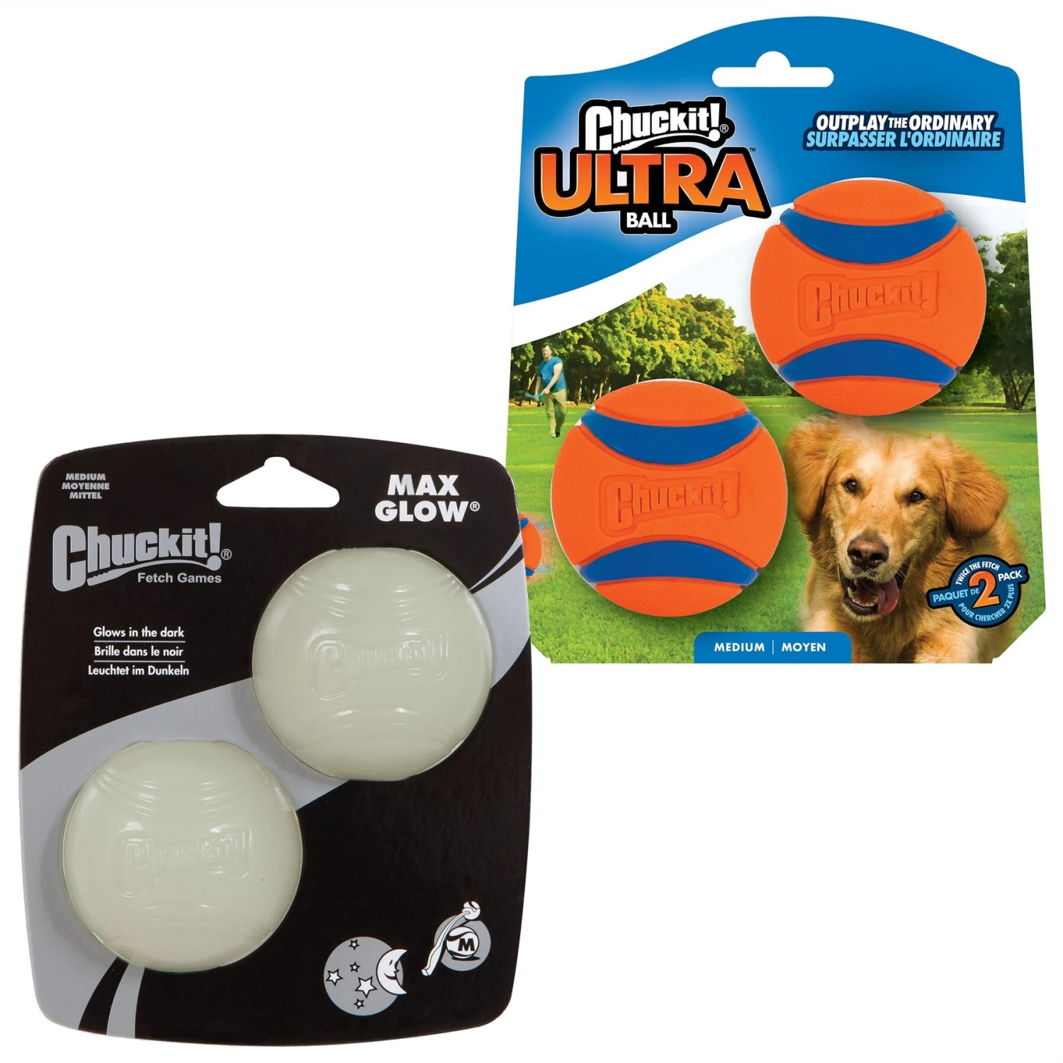 - Chuckit! Max Glow Ball Dog Toy, Medium, 2 count—Glow-in-the-dark ball gives off a bright, long-lasting glow for fetch in the dark.