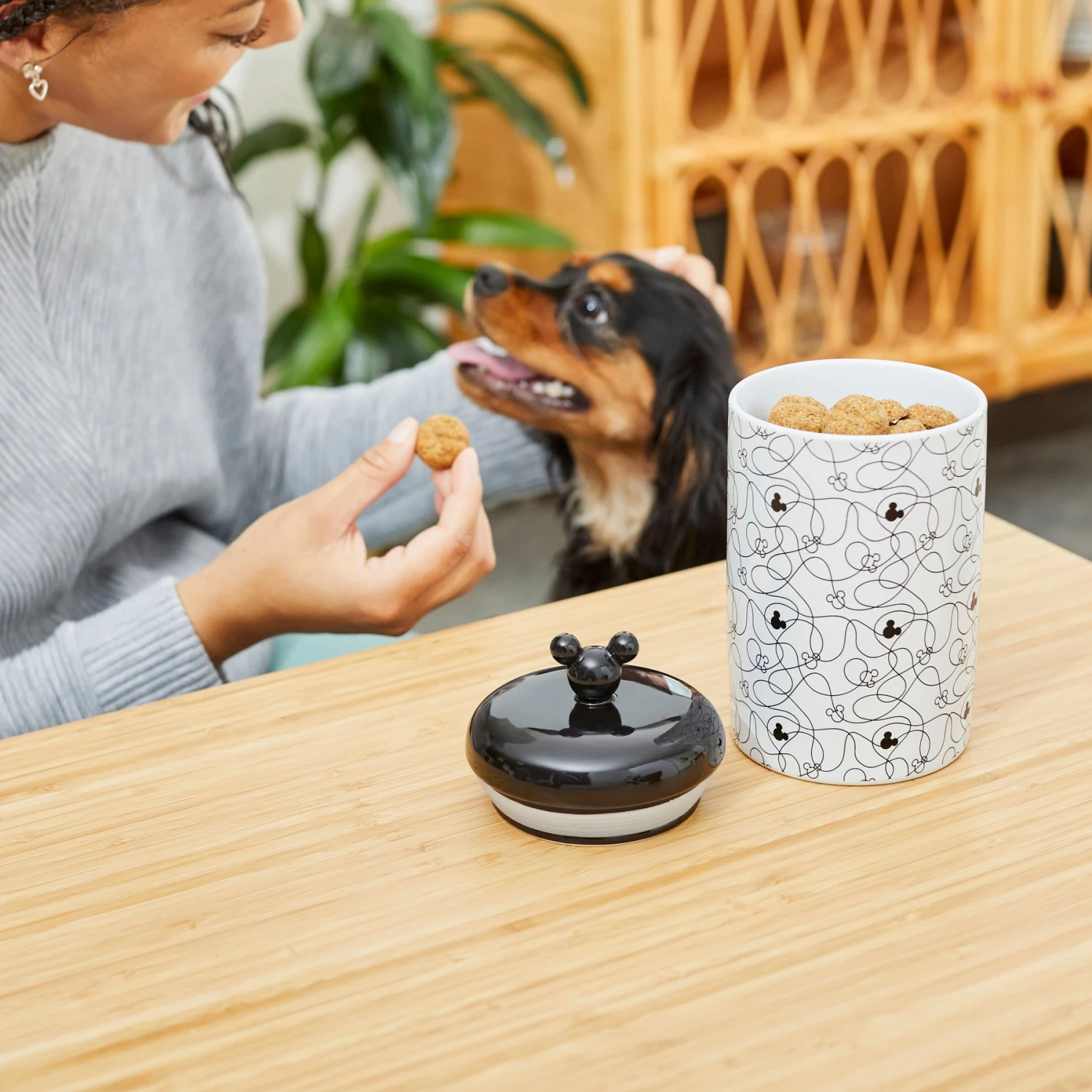 - Cute treat jar with a modern, black-and-white Mickey-themed design.