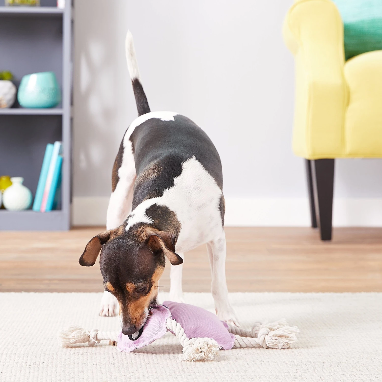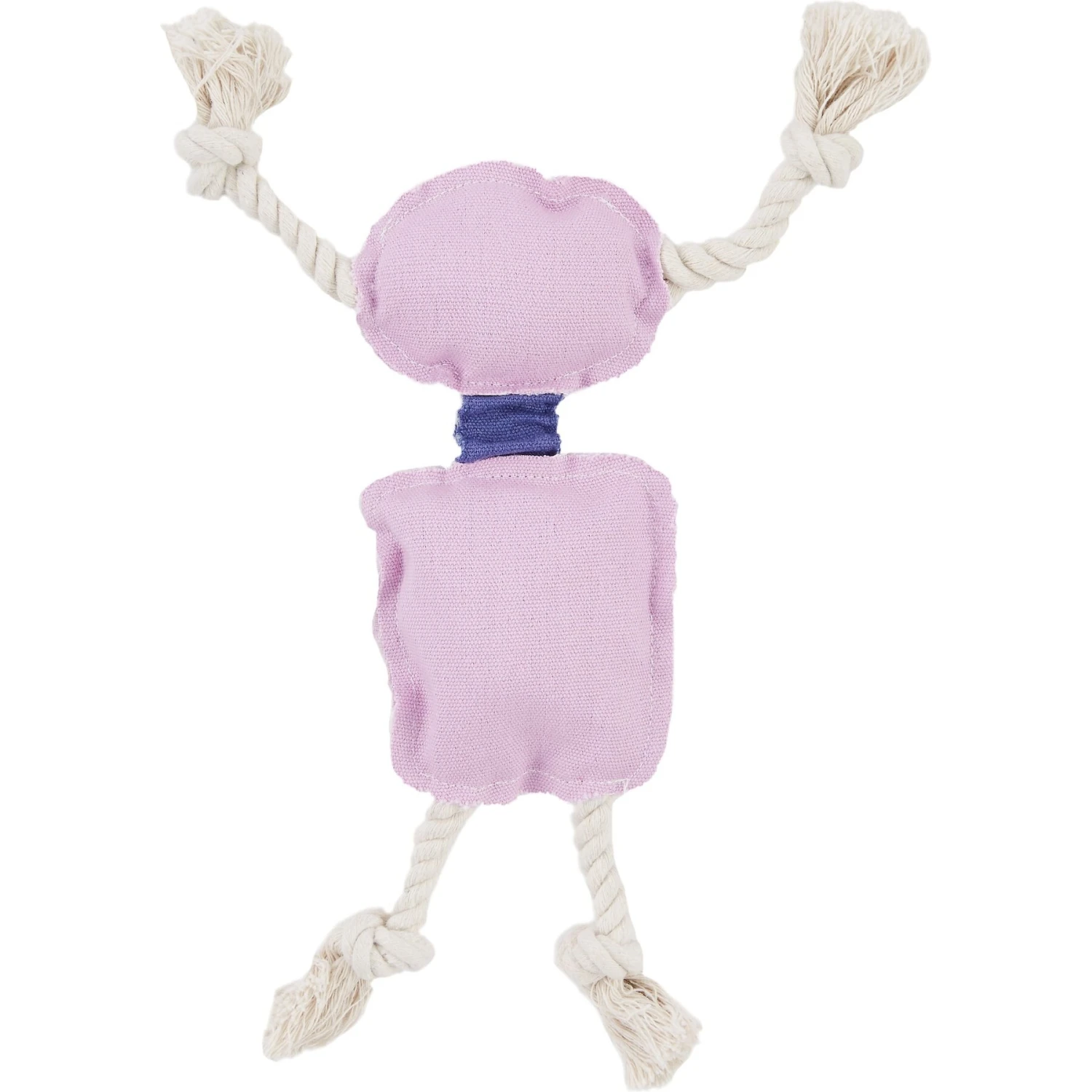 - Double-stitched canvas encases squeakers while durable rope legs and arms extend from the bottom, creating variating textures for your curious pup.