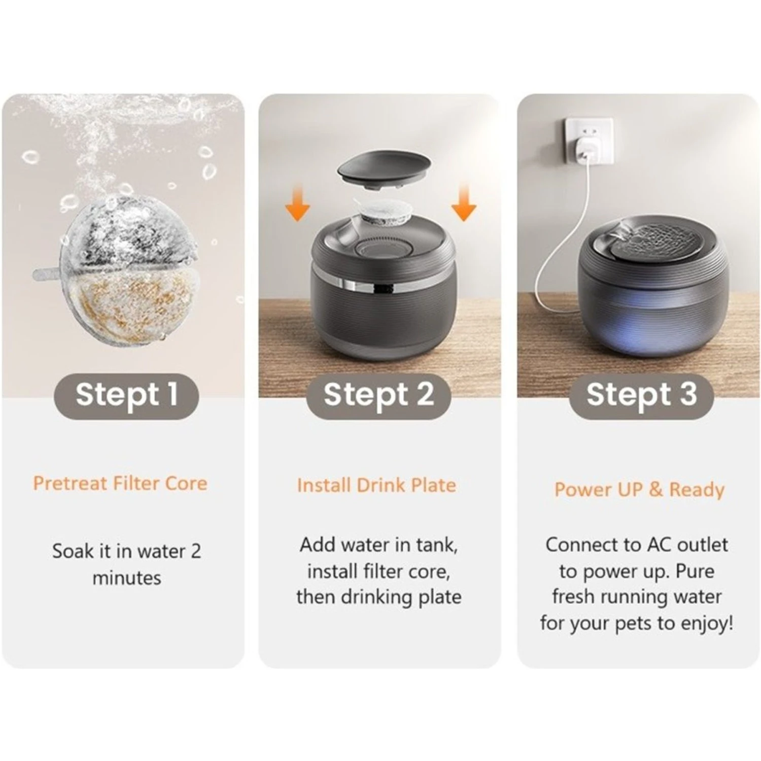 - The free-falling water stream makes a welcoming sound that encourages cats and dogs to drink.