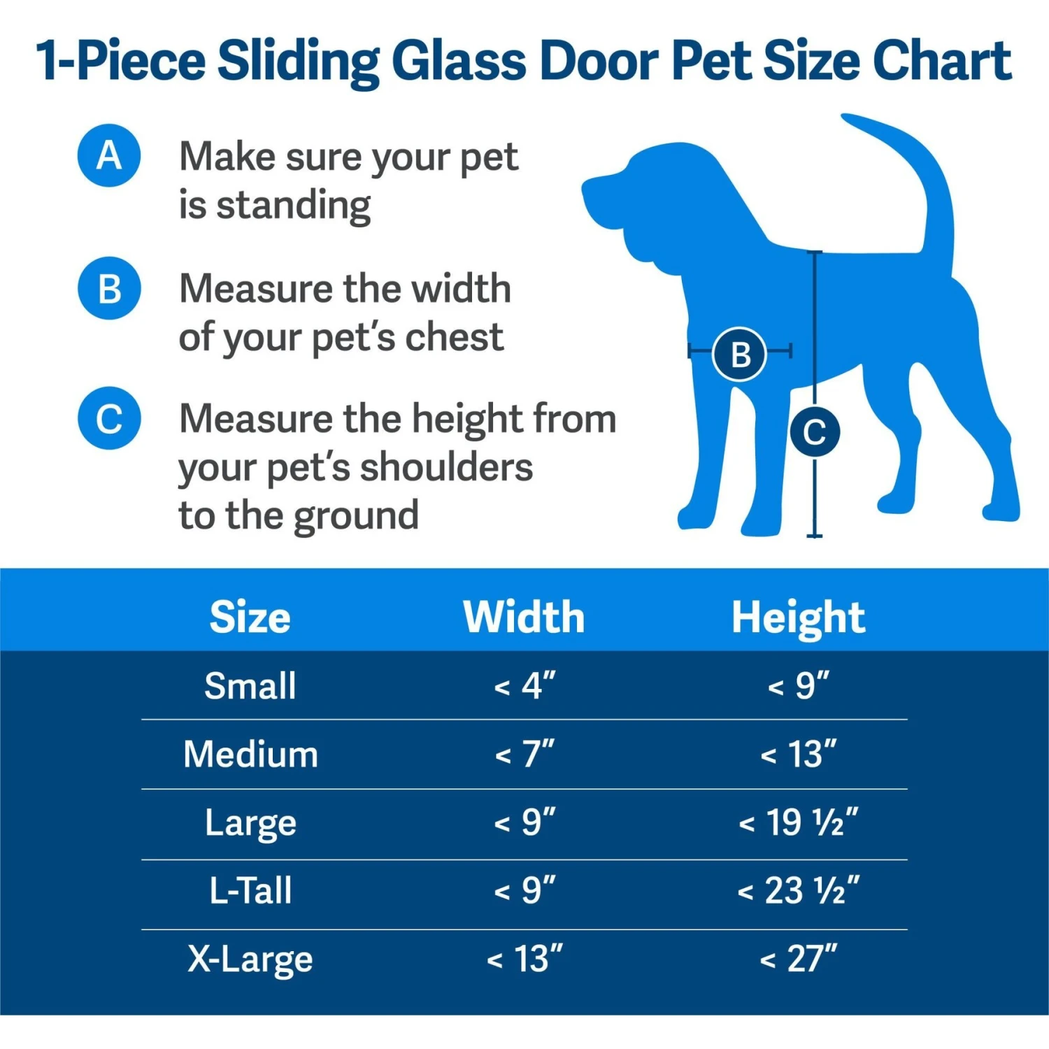 Before purchasing any Freedom® Patio Panel Pet Door, you need to determine the height of your sliding glass door frame opening. Measure from the highest point in the upper door track to the lowest point in the lower door track.