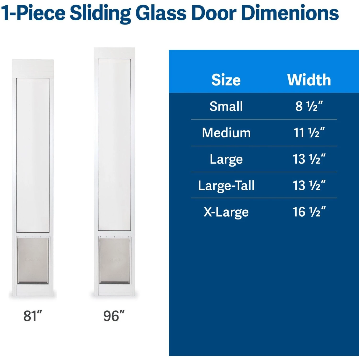 PetSafe Freedom Patio Pet Doors for Sliding Doors allow your pet to come and go as he pleases, through your sliding glass or screen door. These panels feature a heavy-duty aluminum construction and shatter-resistant, tempered safety glass. They’re also equipped with the energy-conserving UltraSeal flexible flap system designed to keep the heat and cold outdoors. Installation is easy, with no cutting required. Simply slide the panel into one end of your sliding door track, secure it to the frame, and add the weather stripping. Open and close the other side of your door easily. And if you ever need to move, you can easily remove the panel from the frame and take it with you. Fits left or right sliding glass doors, 91 7/16 to 96 inches tall with a 3/4 inch track. Does not fit recessed sliding glass doors without additional hardware.