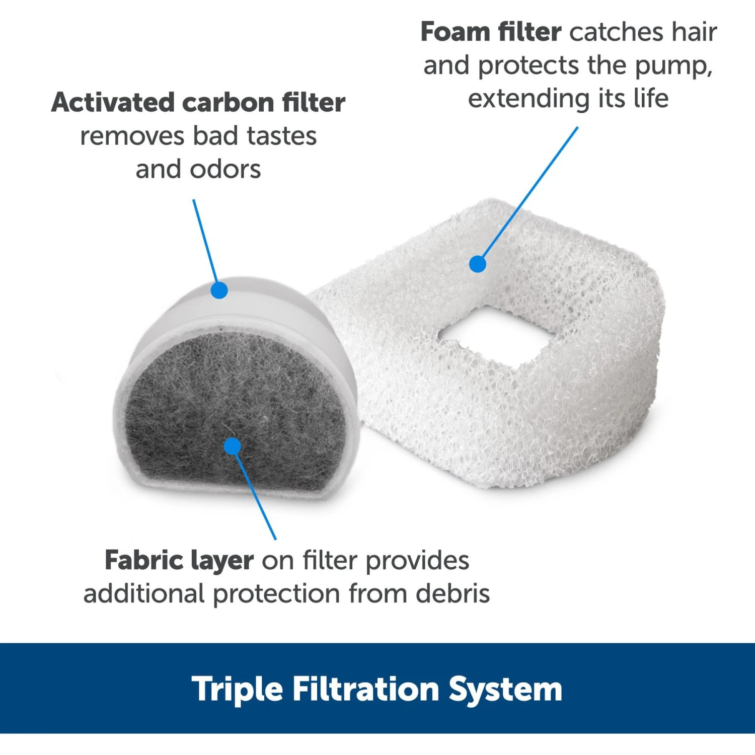 - Dual filtration removes odors, hair, and debris, providing clean water for your furry little one.