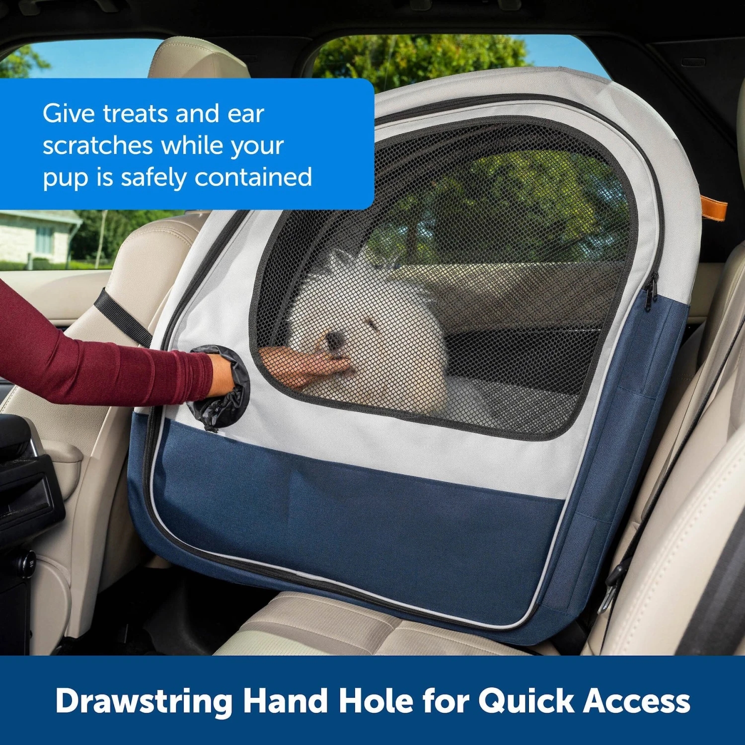 - Portable pet crate feels spacious inside but only takes up one car seat.