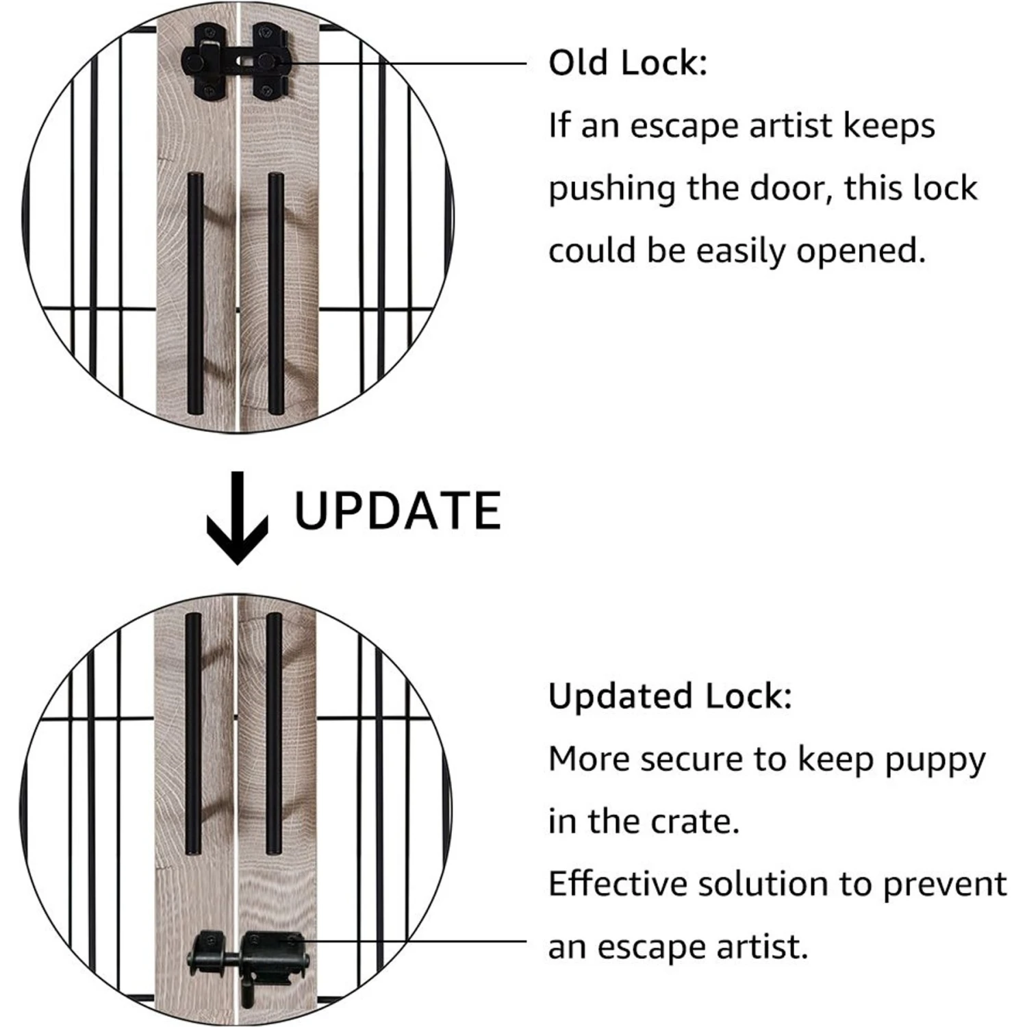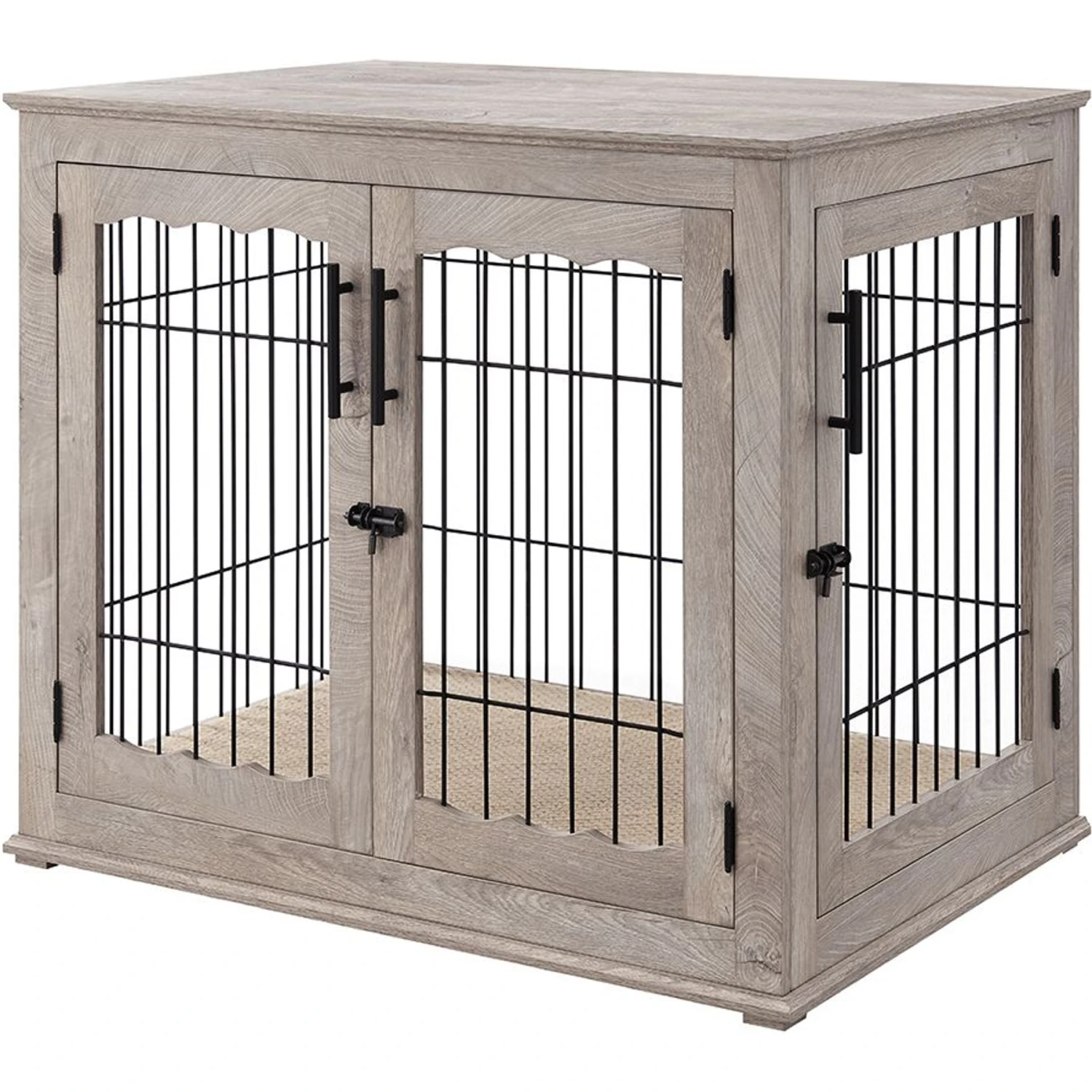 - Stylish wooden dog crate with metal wire panels doubles as a side table, end table or nightstand.